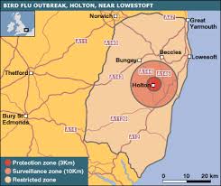 - 2007 Suffolk Turkeys (east anglia connection). H5N1. 5 days to confirm virus identity. At outbreak all poultry culled, restricted access and visitors disinfected. In the 3km protection zone poultry were kept indoors and tested. In the 10km surveillance zone no poultry movements apart from slaughter, bird fairs and markets banned, domestic birds not to use same water as wild birds, people in towns not affected unless they kept poultry. Restriction zone had isolation of poultry from wild birds, and licensed poultry movements.