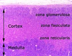The adrenal gland is split into the cortex and medulla. The cortex is further split into three layers which are shown above. The cortex should appear 1mm thick.